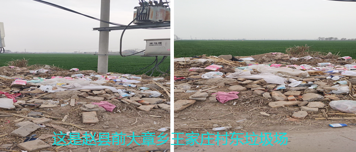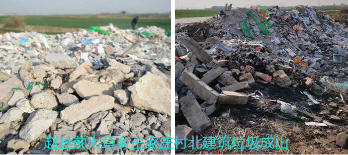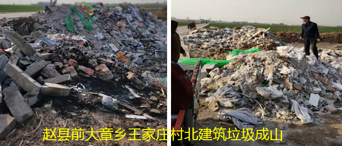 【人民之声新闻网络电视台赵岩、张越、李佳艳报道】我台工作人员接到群众多次举报,赵县前大章乡王家庄村北建筑垃圾似如小山,我们就沿着举报人指引路线顺着去双庙的公路,颠覆的来到了前大章乡管辖的小马圈村往南的硬板公路,到了存放垃圾的地点,